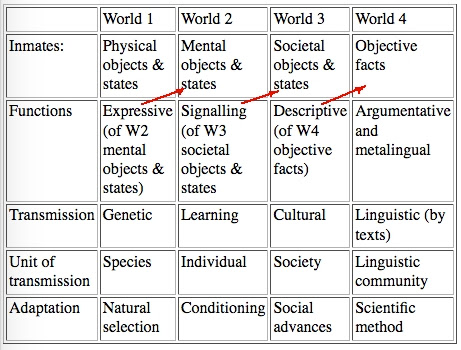 54- "There is a hierarchy of linguistic theory - types, corresponding to the four worlds." (Treating language as a physical, a mental & subjective, a social or an objective fact).