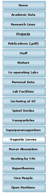 The idea of studying magnetic losses is to understand how are the several mechanisms involved affecting the whole power dissipation. The amount of energy involved in each cycle (see left figure) is just the area of the M(H) curve. So it is clear that if you want to control the amount of this dissipated energy, you must design a material with the adequate MxH response. From general arguments we can determine some of the parameters governing the dissipation of energy. For example: Resistivity/conductivity: Form metallic materials, the conductivity s will influence the facility to generate eddy currents on the material's surface. Magnetic hardness: The (maximum) magnetic field strength H for the magnetic losses will determine the final amount of energy dissipated. This is true up to the saturation value, above which all the magnetic moments are already aligned with the field, so there is no more changes in the magnetic structure of the material. |