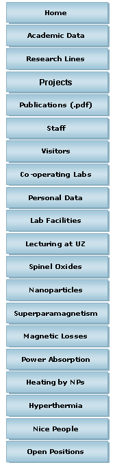 Clearly, the success of such approach depends critically of the ability to specifically attach a given particle on a certain type of cells, those who are to be killed. This is a quite complex biochemical, biological and medical issue, though many groups are working on it. Other issues to be solved (depending on the kind of organs to be treated) are: to transport to the target, to cheat the body immune system, to minimize the mass of magnetic material, to detect possible accumulation of magnetic material in other organs. Regarding the energy loss at the MNPs, there are two different effects to be considered: a) magnetic losses through spin-flipping of the single-domain magnetic moment (called Néel losses); and b) energy loss from mechanical rotation of the particles, acting against viscous forces of the liquid medium (Brown losses). For details of these two mechanisms, go HERE For clinical applications, the granular materials should present low levels of toxicity, as well as a high saturation magnetic moment in order to minimize the doses required for temperature increase. In this context, magnetite (Fe3O4) is a promissing candidate because presents a high Curie temperature (TC), high saturation magnetic moment (90-98 emu/g, or ~450-500 emu/cm3), and has shown the lowest toxicity index in pre-clinic tests. Although from the point of view of synthesis the material is cheap and can be obtained with high purity from relatively easy routes, the fabrication of MNPs with high structural order, and having few nanometer diameters is intrinsically complicated since the high surface/volume ratio makes the surface disorder effects to be important. |