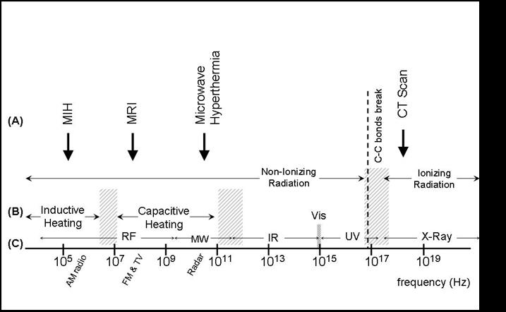 Frequency ranges for (A) some of the most used diagnostic/therapy equipments for clinical protocols, and (B) the main physical mechanisms at each frequency range. Also shown in (C) is the common nomenclature for the electromagnetic waves at each region: RF = radiofrequency; MW = microwaves; IR = infrared; Vis = visible; UV = ultraviolet and X-Ray. |