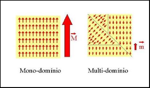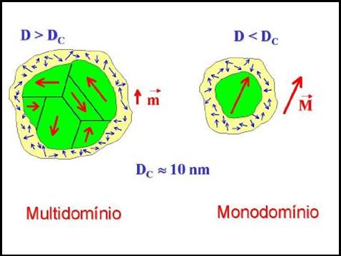 On the other hand, if the dimensions of the material under consideration is reduced drastically, until a few nanometers (1 nanometer = 10-9 = 0.000000001 meter), these domain walls will be forced to shrink and coexist in a small volume, thus increasing the "repulsion" among them. This proximity (density) of domains when the material reaches dimensions at the nanometer scale, yields the domains to merge into a single one, creating what is known as a single-domain particle (usually a nano-particle). The exact dimensions at which a nanostructured material passes from single-to multi-domain depends on each material, and is known as Critical Size. If the particle is spherical, it is called in critical diameter. (Figure 5) |