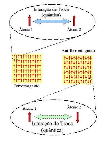 These two types of magnetic moment, when observed in macroscopic scale, is what produces the force of attraction, for example, between two magnets. Depending on the number of electrons of each atom, and its overall arrangement, the total magnetic moment of an atom can differ greatly, causing some atoms to be more suitable for the production of, for example, permanent magnets. Also, there is a force of quantum origin (called the exchange or superexchange) that tends to align the magnetic moments of two neighboring atoms in parallel (ferromagnetic) or antiparallel (antiferromagnetic) directions, as shown in Fig. 3. This interaction is stronger than any other between atoms in a material (eg, to destroy the order that exists inside of a piece of metallic iron , we should warm up (i.e., provide thermal energy) to a temperature of 800 ºC!. |