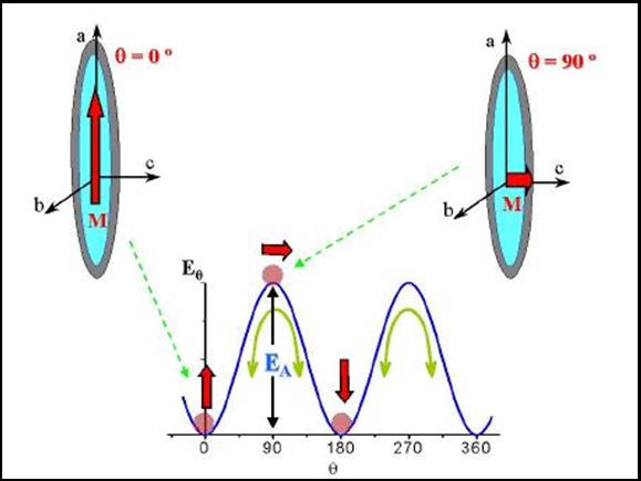 In a nano-particle each atom is part of a magnetically ordered arrangement, with the magnetic moments aligned in one direction space, and therefore the total magnetic moment is the sum of all moments of the atomic particle. If we realize that the separation between atoms is of the order of tenths of a nanometer, one can conclude that in a sphere of radius of a few tens of nanometers, the total number of atoms is of the order of 1000-10000. Therefore, the total magnetic moment of a single-domain nanoparticle can be about 10,000 times greater than the atomic moments of the constituent atoms.The behavior of a set of such a single-domain nanoparticles can be very complex due to the fact that the magnetic moment of each particle disturbs the behavior of neighbor particles. In general, this interaction between particles serves to align the magnetic moments in order to also reduce the energy of the whole. In some cases a preferred direction can exist for the magnetic moment of each particle, as for example the case of needle-shaped particles (Figure 6). In such a situation, the magnetic moment prefers to be oriented along the major axis of particle, either up or down (so to diminish another energy: the magnetostatic energy). The preferred direction or axis is called "easy axis", and may also occur in particles of any shape because of asymmetries of chemical bonds typical of many materials. We see that, for a particle with anisotropy axis of the type shown in Figure 6 (called uniaxial), the magnetic moment can turn from the position theta = 0 ° to 180 °, only if it has an energy equal to or greater than the energy of the 'anisotropy barrier' EA. |